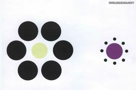 【解析】两个内部的圆大小完全一样。当一个圆被几个较大的同心圆包围时,它看起来要比那个被一些圆点包围的圆小一些。