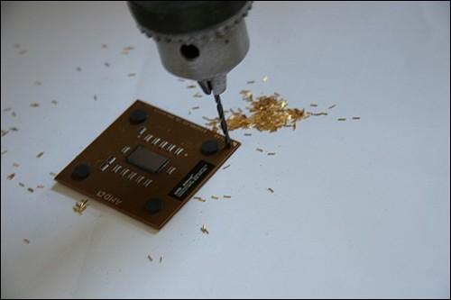 下面轮到钻头发威:我们需要在CPU的一脚钻出一个大小合适的孔